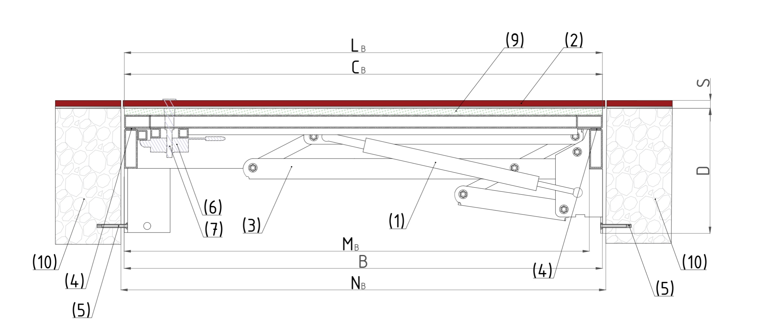 The hatch frame is made of S235JR grade steel, which is widely used in various structural applications. To ensure strength and corrosion resistance, stainless steel pins are used in the hinges.